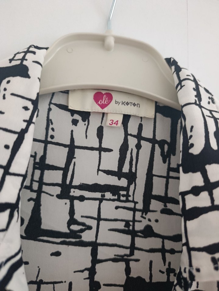 Pamuk kumaştan, baskılı desenli, düğmeli, V yakalı ve uzun kollu bol kesim kadın gömleği. Sokak modasına uygun, 34 beden.