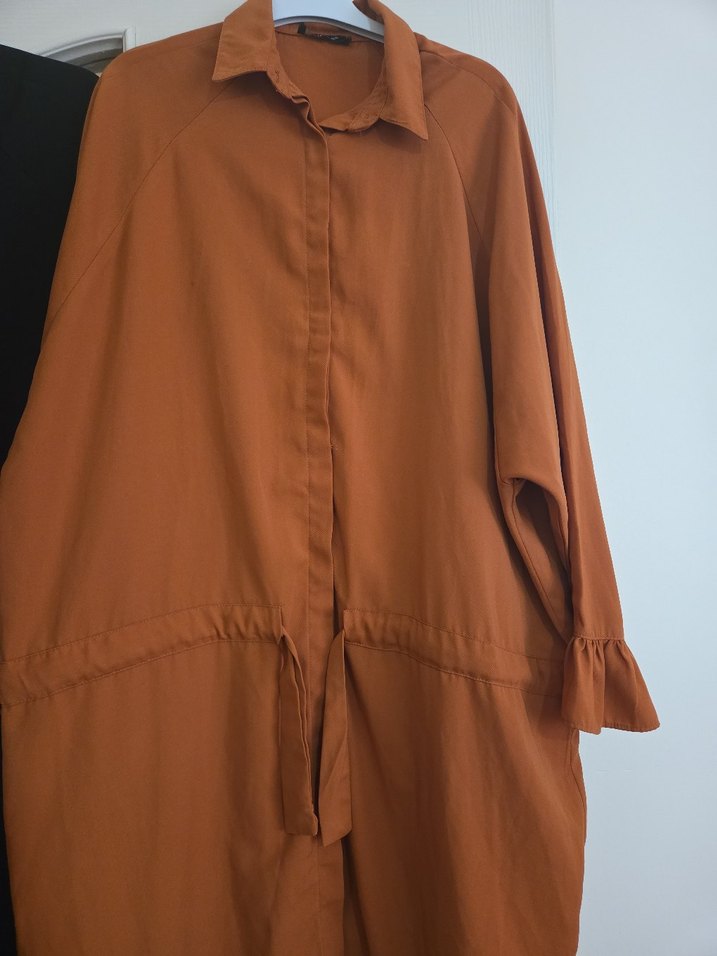 Kadınlar için camel renginde, yüksek yakalı ve askılı kollu, sentetik kumaştan midi uzunlukta, bol kesim ve drapeli desen içermeyen trenchcoat. Günlük kullanıma uygun. adet fiyatı dır biri siyah diğeri taba ranginde
