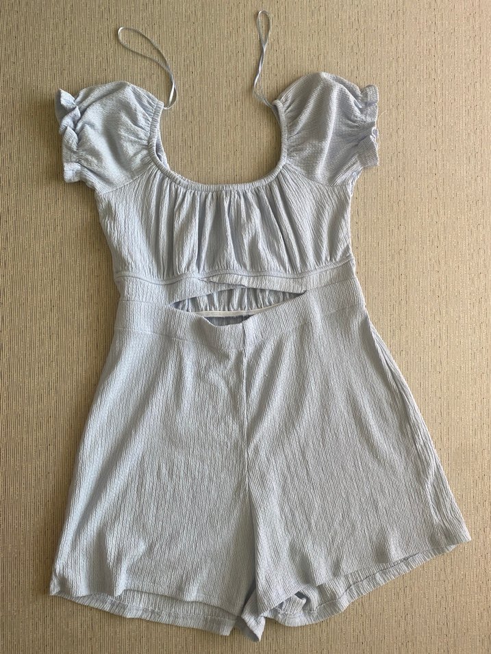 Bebek mavisi renginde, kısa kollu ve fırfırlı detaylı, straplez yakalı keten kumaştan yapılmış, vücuda oturan midi uzunlukta tulum. Minimalist sokak stili.