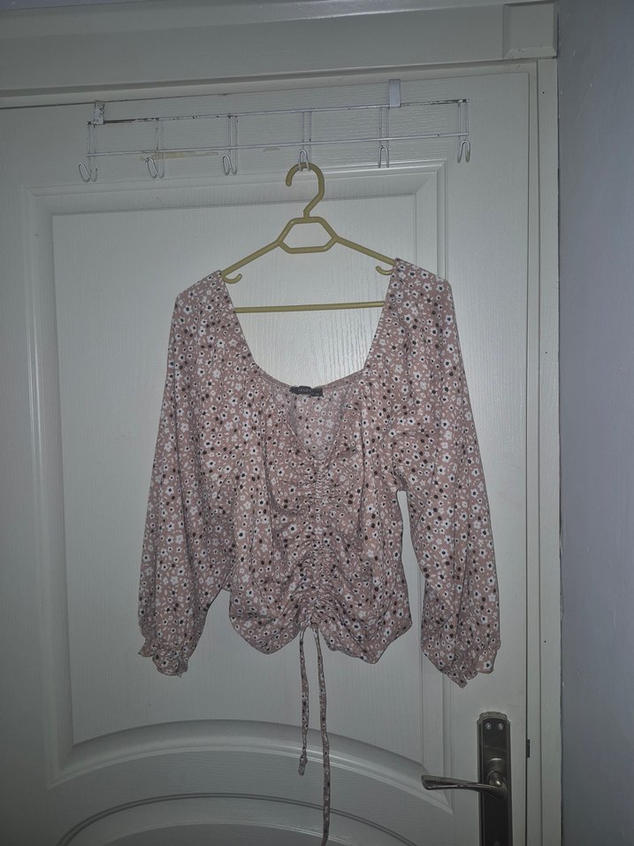Kadınlar için uzun kollu, V yakalı, bol kesim bej tonlarında bağcıklı kısa bluz. Hafif sentetik kumaştan, günlük kullanıma uygun.