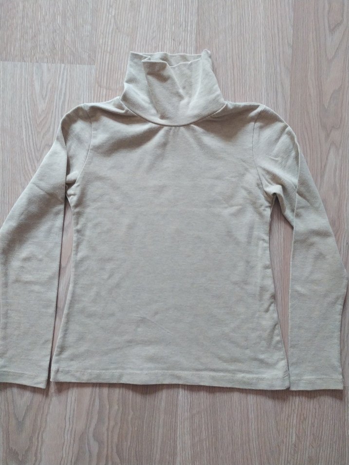 Kadınlar için balıkçı yakalı, uzun kollu, bej renkte, ince keten kumaştan yapılmış, vücuda oturan normal uzunlukta triko. Günlük kullanıma uygun, rahat ve sade tarzda.