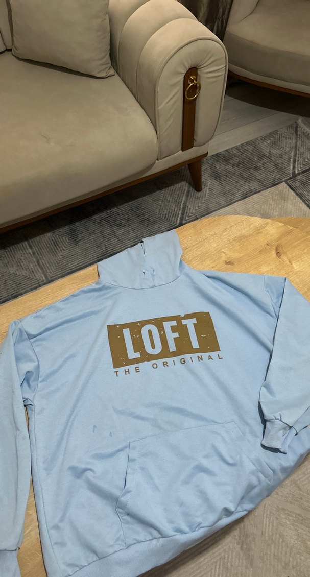 Uzun kollu, fermuarlı bej sweatshirt. 'LOFT' baskılı, rahat kesim ve yumuşak kumaşlı günlük kullanıma uygun. (Kapşon ipi yok kaybolmuş)