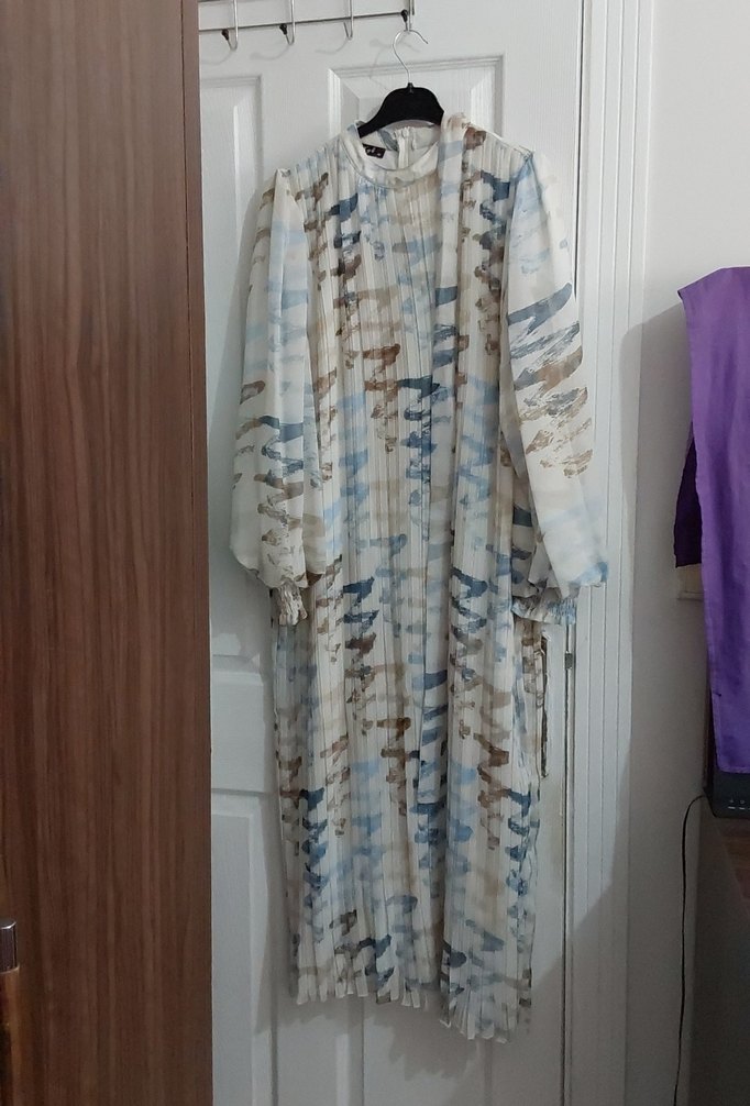 Kadınlar için piliseli, yüksek yakalı ve uzun kollu bej-bohem tarzda bağlama desenli uzun elbise. Rahat kesim ve yumuşak sentetik kumaş hiv giyilmedi