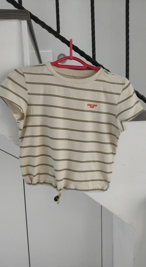 Kadin Bej Çizgili Kısa Kollu Crop Tişört