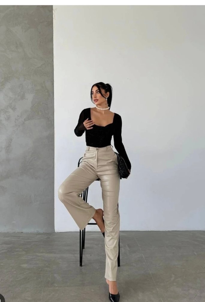 Ofis için uygun, midi boy, regular fit bej deri cigarette pantolon. Minimalist ve normcore tarzıyla zahmetsiz şıklık sunar.