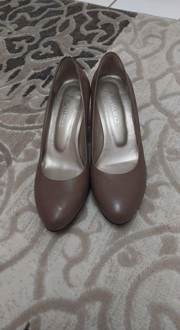 Bej deri, tokalı, klasik ve konvansiyonel tarzda, ofis kullanımı için uygun yüksek topuklu stiletto ayakkabı.