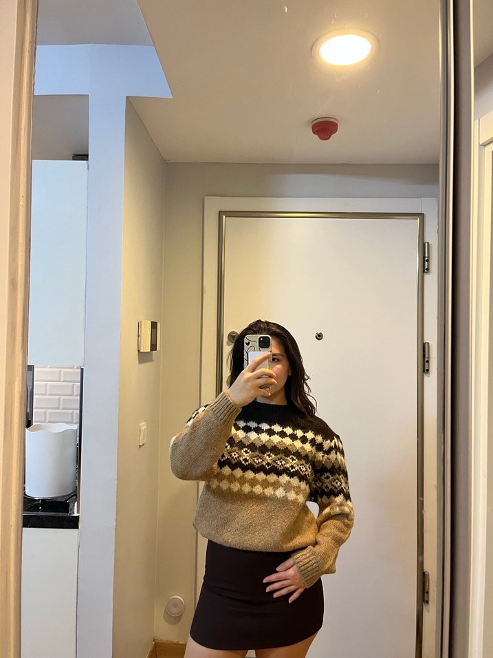 Kadın bej renkli, uzun kollu, yuvarlak yaka triko kazak. Gevşek kesimi ve batik desenleriyle rahat ve şık bir günlük tercih. Mango muadil