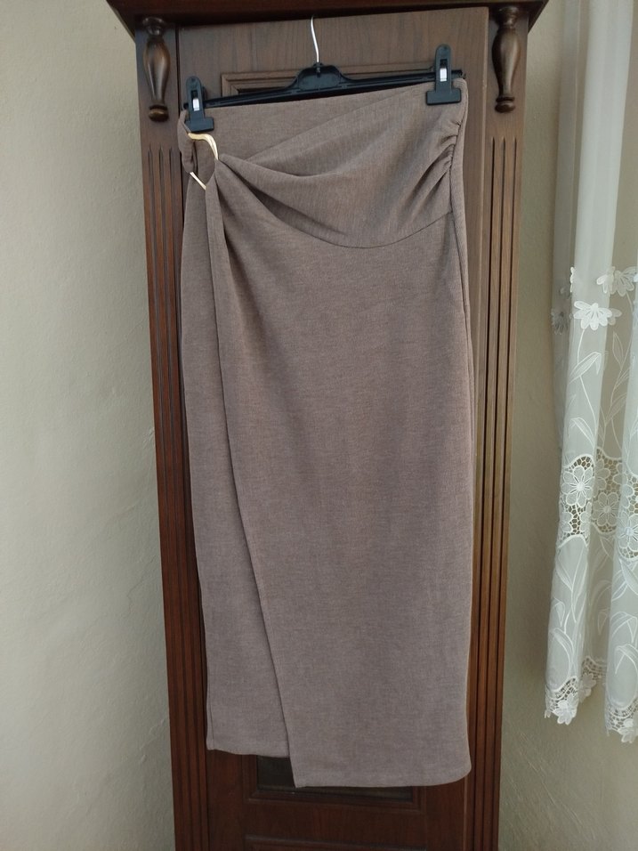 Uzun bej renkli, drapeli tasarıma sahip ve normal kesim olan bu etek, triko kumaştan üretilmiştir.