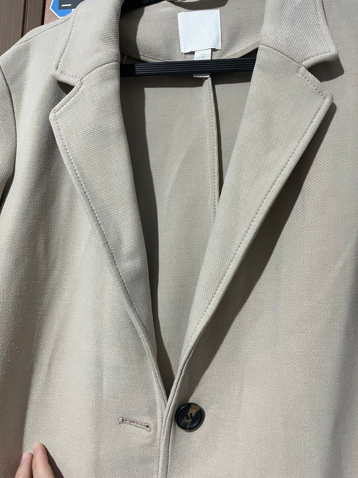 Kadın bej renkli, düğmeli, notched lapel yakalı midi boy kaban. Uzun kollu, regular fit ve ofis kullanımı için uygun. Hm orijinal