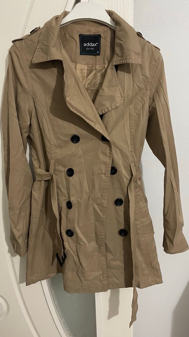 Bej renkli, düğmeli bu trençkot, astarlı keten kumaştan yapılmıştır. İnce kesimi, uzun kolları ve kesik yaka detayıyla günlük ve sokak stiline uygundur.