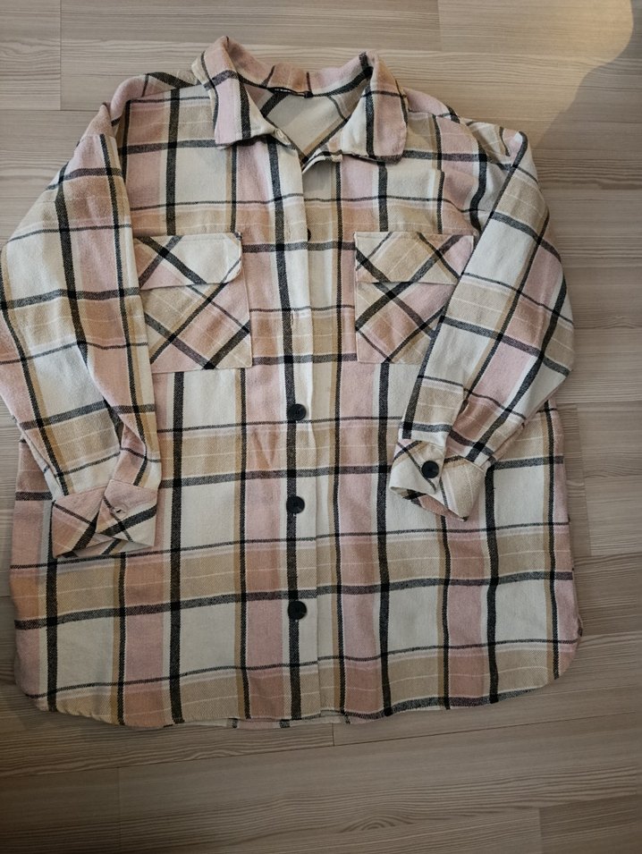 Kadınlar için bej tonlarında pastel kare desenli, düğmeli uzun kollu, rahat kesim gömlek. Yumuşak sentetik kumaştan üretilmiş, notched lapel yakalı, günlük sokak stiline uygun gömlek.kol düğmesinin biri farklı orta kalınlıkta ürün