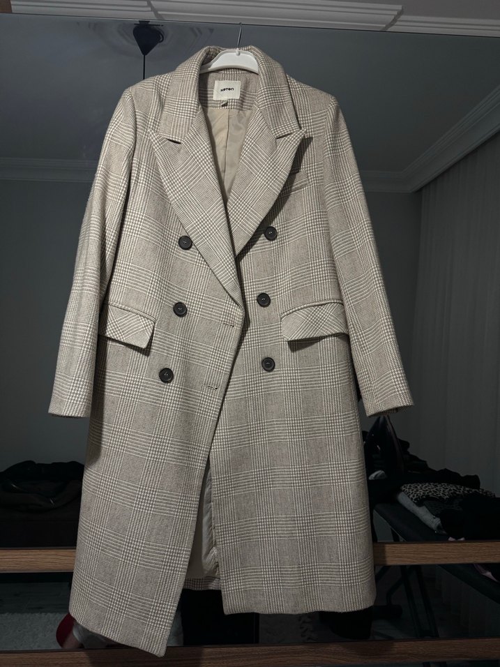 Kadın Bej Ekose Uzun Düğmeli Kaban