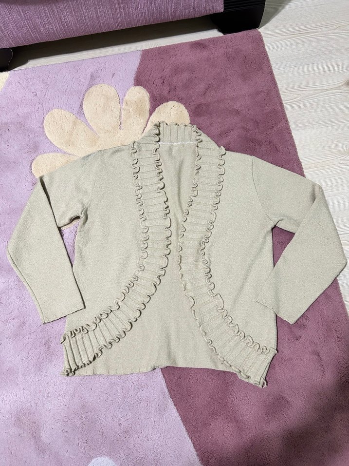 Bej renkli, uzun kollu, fırfır detaylı, düz örme kumaştan yapılmış bol kesim hırka