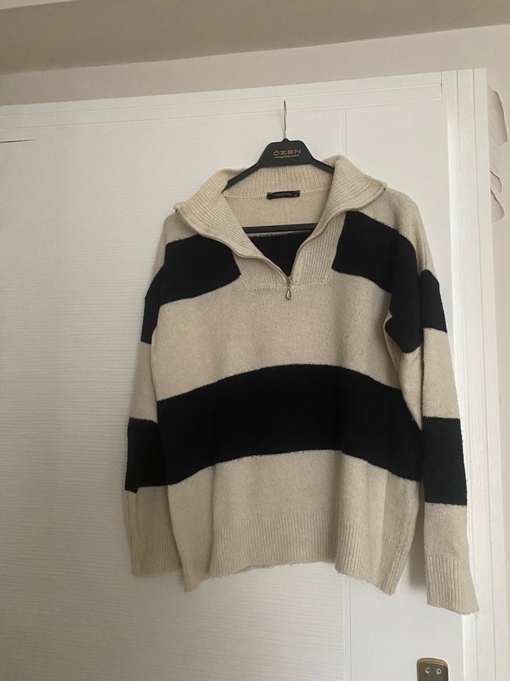Yüksek yakalı fermuarlı, uzun kollu, bol kesim kadın trikosudur. Yumuşak yünden üretilmiş, bej ve gri geniş çizgiler içerir, sokak modası ve günlük kullanım için uygundur.