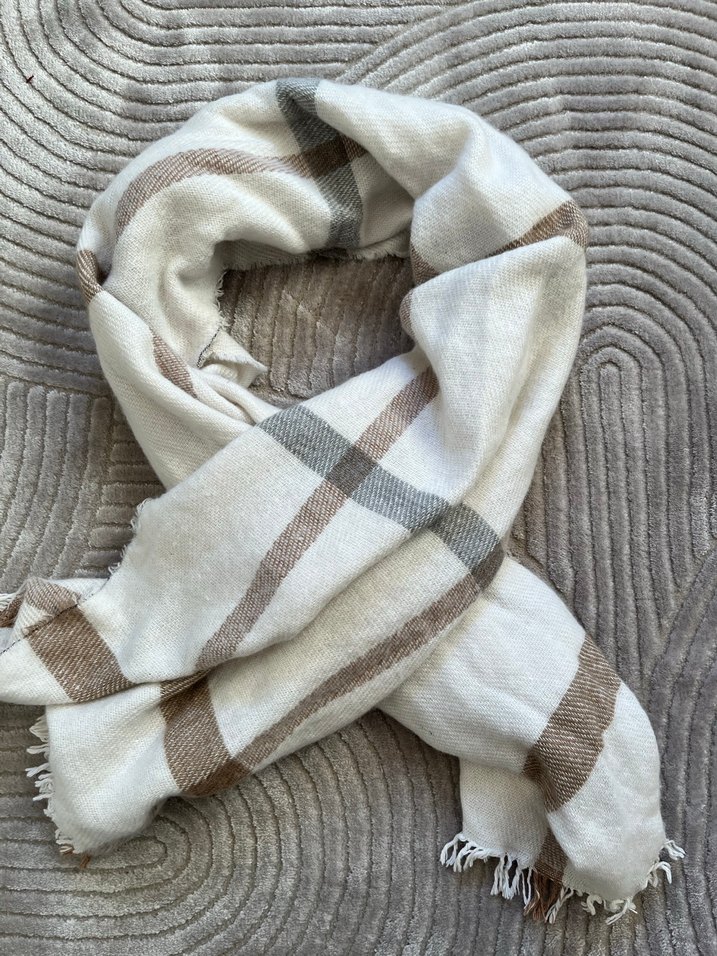 Yumuşak yünden örülmüş, bej ve gri kare desenli, sade ve bohem tarzda kadın şalı. Rahat ve sıcak tutar.