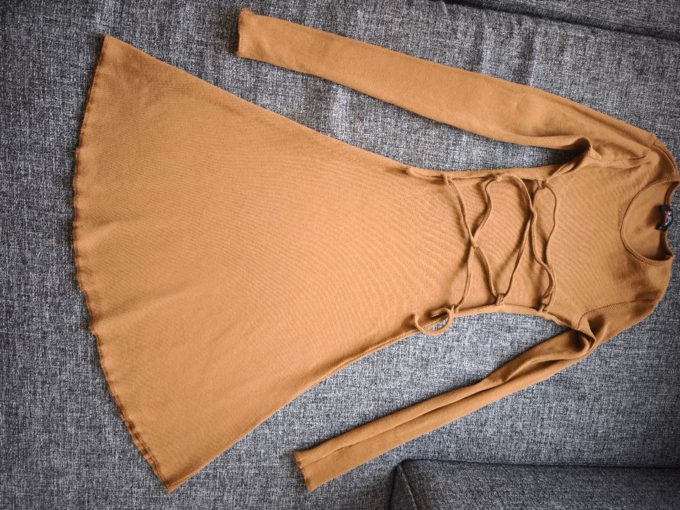2 defa giyildi temiz defosuz ürün Bej renkli, ince triko kumaştan, sırt bağcıklı, tek renk midi elbise. rahat ve şık bir sokak stili sunar.