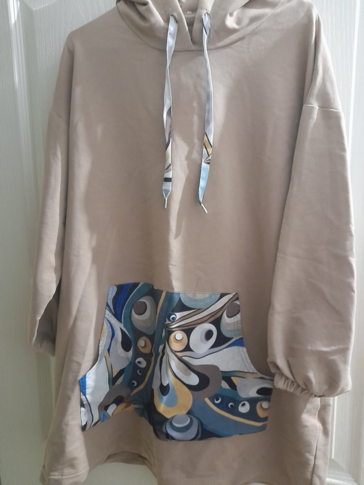 Uzun kollu, bej renkli, bol kesim kadın sweatshirt. Önde mavi ve gri tonlarda baskılı cepli, drapeli tasarıma sahip, günlük kullanım için uygundur.
