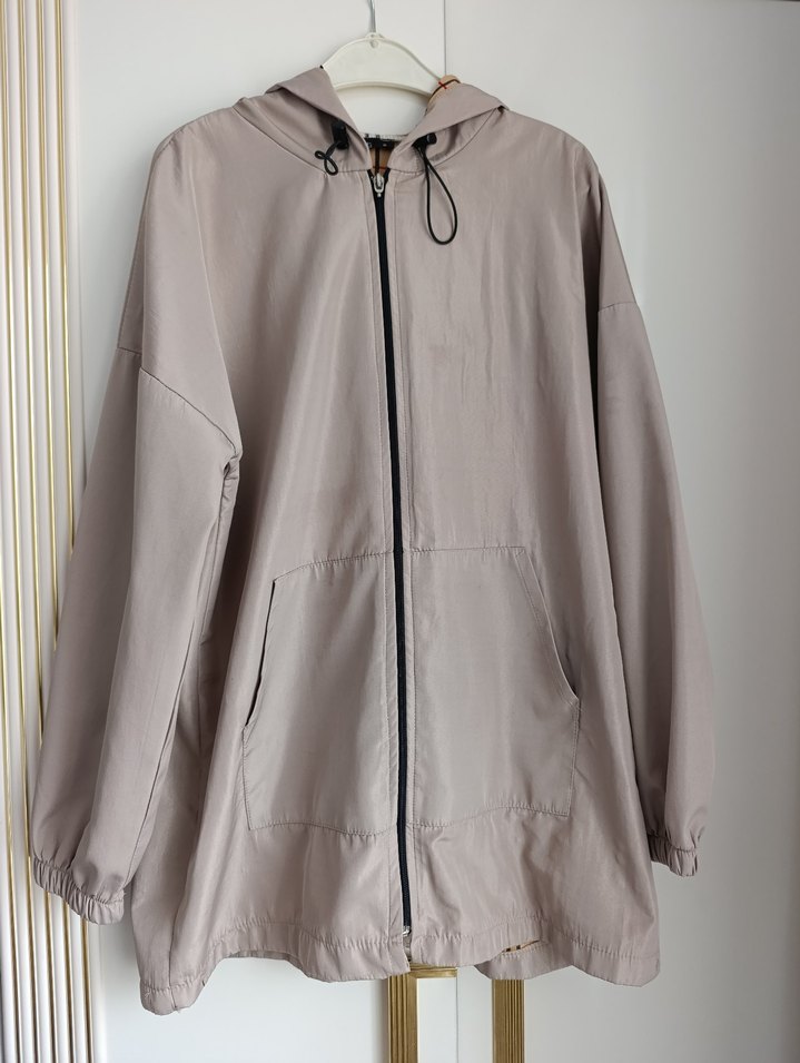 Kadınlar için kapüşonlu, uzun kollu, bol kesim ve fermuarlı kısa uzunlukta sentetik kumaştan üretilmiş bej-gri renkte yağmurluk. Rahat ve şık sokak stili için uygun. ☔