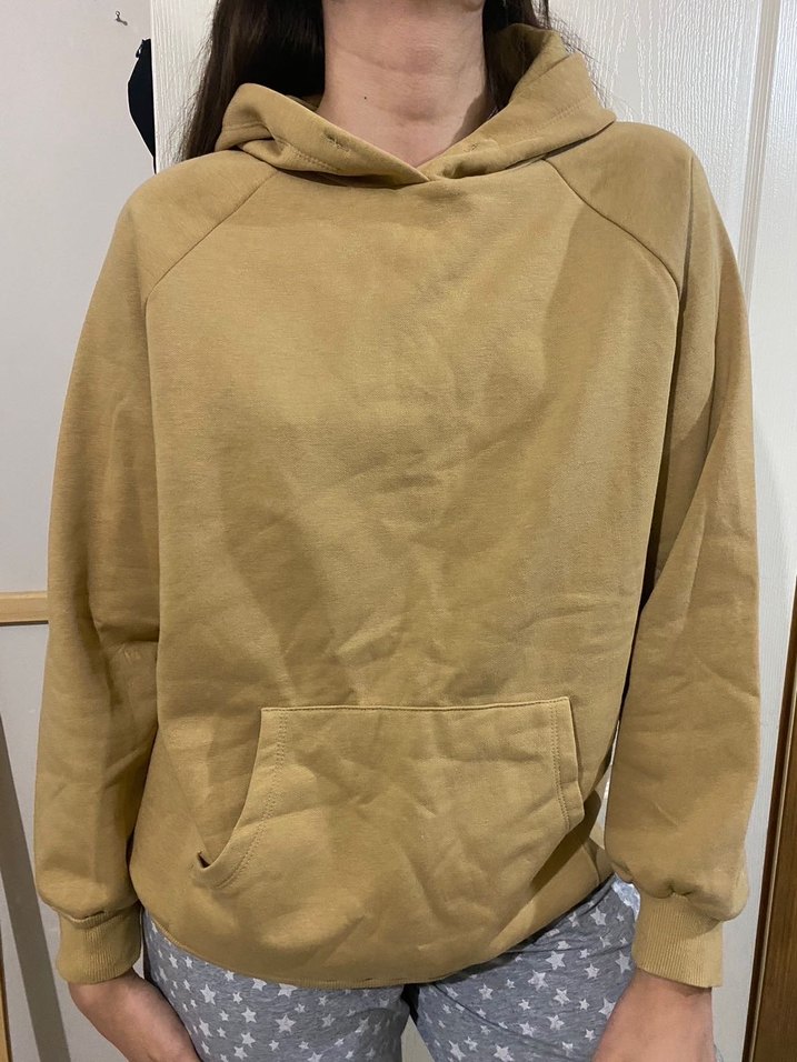Yumuşak ve sıcak kumaştan, kapüşonlu ve uzun kollu, bol kesim bej sweatshirt. Ön cep detaylı, günlük kullanıma uygun rahat bir sokak stili.