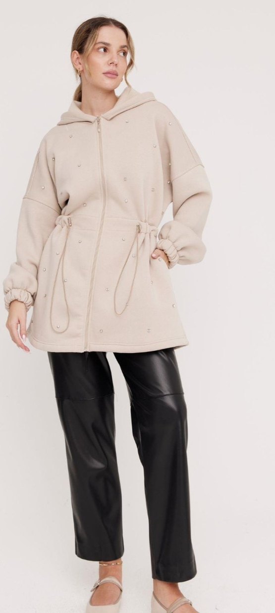 Kadın bej süet ceket, kapüşonlu ve bol kesimdir. Uzun kollu, kürk detaylı ve belden ayarlanabilir. Rahat, trend sokak stili için uygundur.