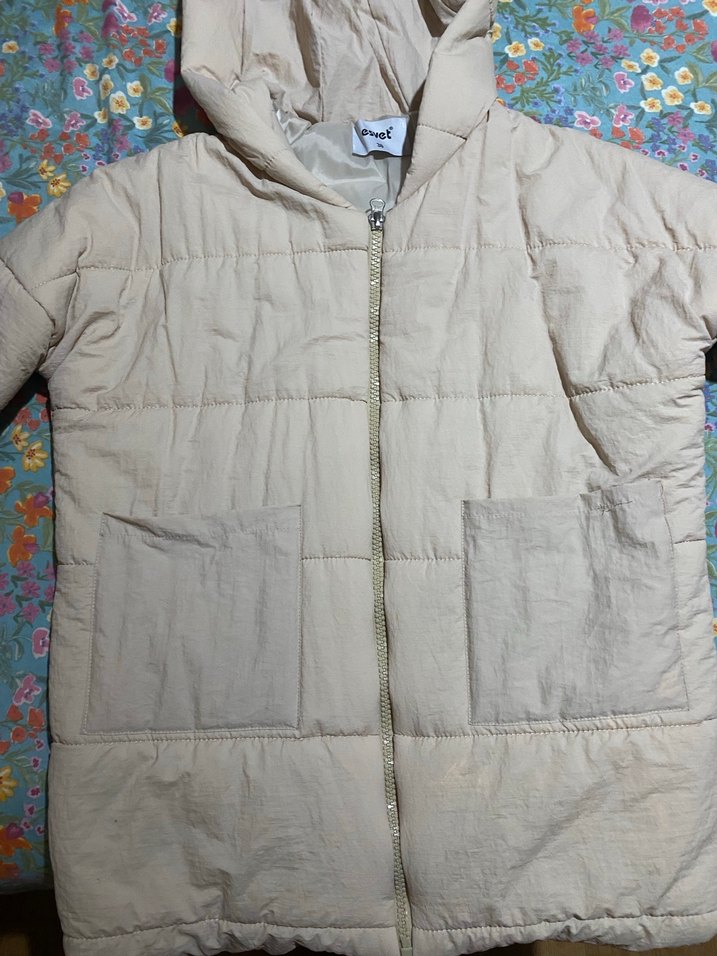 Yumuşak kumaştan yapılmış, kapüşonlu, uzun kollu, fermuarlı ve iki ön cepli bej rengi rahat kesim ceket. Günlük kullanıma uygun sokak stiliyle uyumlu.