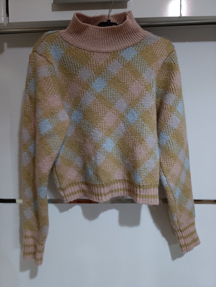 Kadınlar için pastel kareli desende, boğazlı ve uzun kollu, yumuşak örgü kumaştan yapılmış bol kesim ve normal boyda kazak.