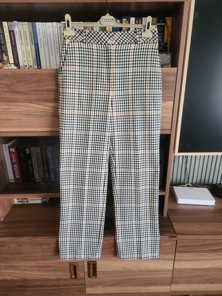 Bej kareli kumaştan, normal boy midi kesim, regular fit pantolon. Sentetik kumaş, tokalı detaylı, günlük kullanıma uygun rahat model.