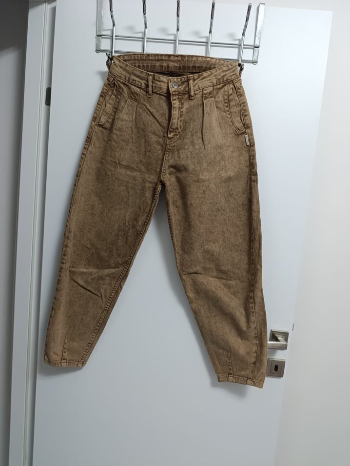 Kadınlar için bej renkli, keten kumaştan, kemerli bol kesim midi boy pantolon. Günlük kullanım için sade ve rahat bir tasarıma sahiptir.