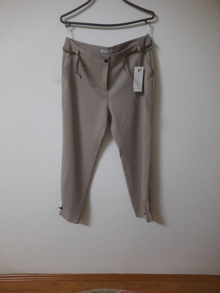 Kadınlar için kemerli, bej renkli kumaş pantolon. Orta boy, regular fit ve ofis ile günlük kullanım için uygun, sentetik yumuşak kumaştan.Butik ürünüdür.