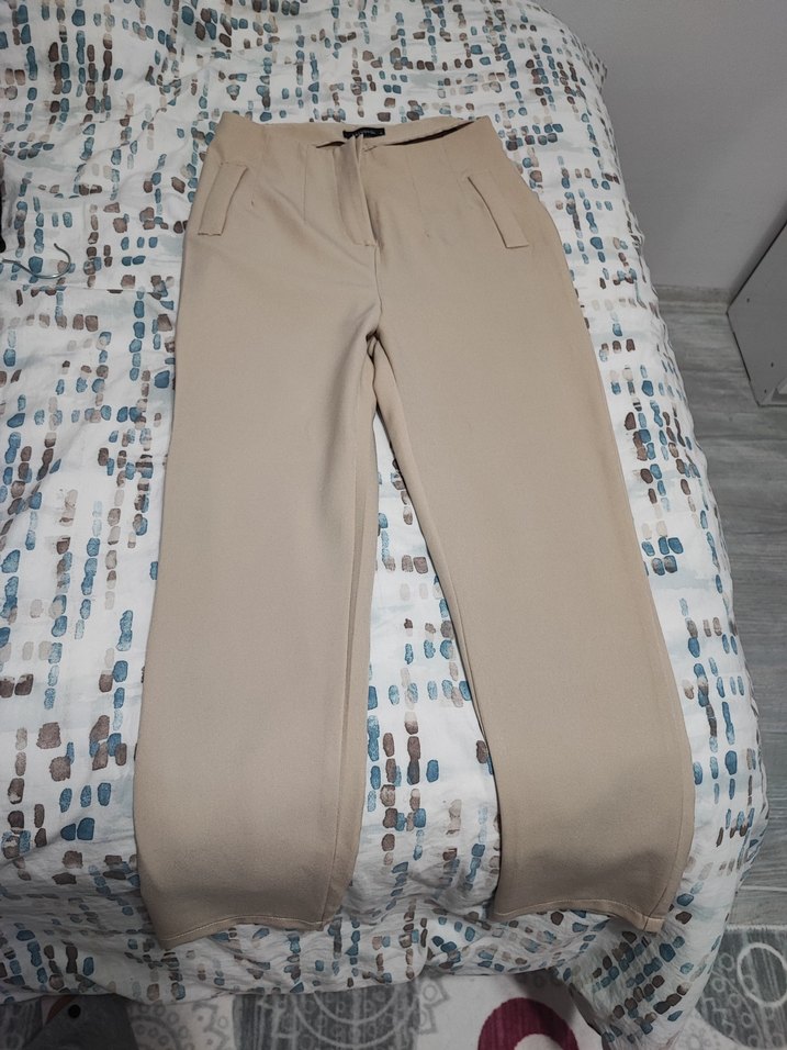 Kadın bej renkli, kemerli ve cep detaylı kumaş pantolon. Normal boy midi kesim, günlük rahat kullanıma uygun.