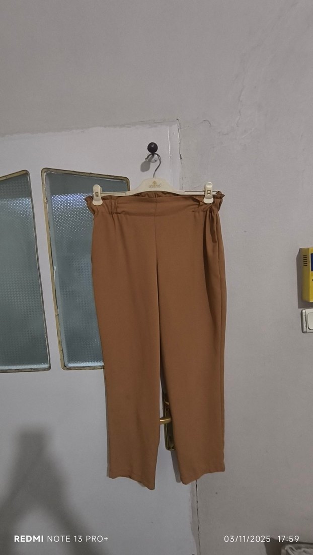 Kadınlar için bej renkli, kemerli ve midi boyda kumaş pantolon. Regular fit ve sentetik kumaştan üretilmiştir. Ofis ve günlük sokak stili için uygun, desensiz ve minimalist. yenidir dar olduğu için satıyorum