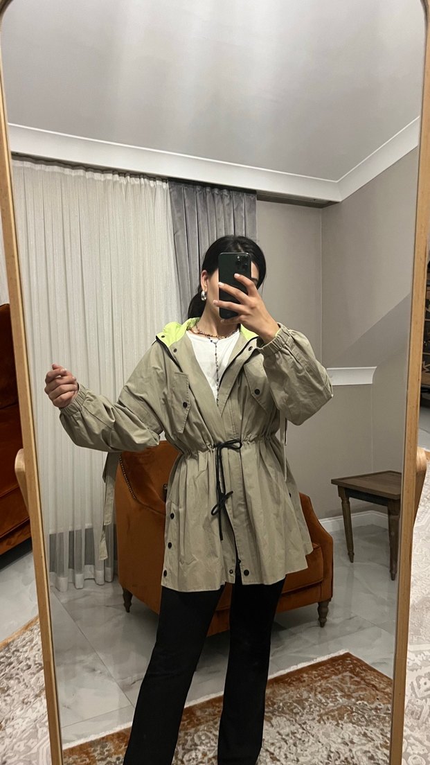 Kadın bej renkli midi trençkot, yüksek yakalı, uzun kollu ve kemerli olup bol kesimdir. Sentetik kumaştan üretilmiştir ve günlük sokak stili için uygundur. Aldığım fiyat (5 buçuk)