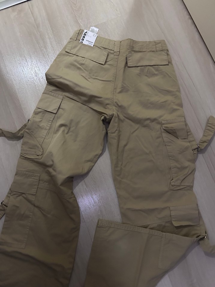 Kadınlar için bej renkte, kemerli ve bol kesim kargo pantolon. Sentetik kumaştan, çok cepli ve sokak stiline uygun, dış mekan kullanımı için ideal. En 35 boy 105