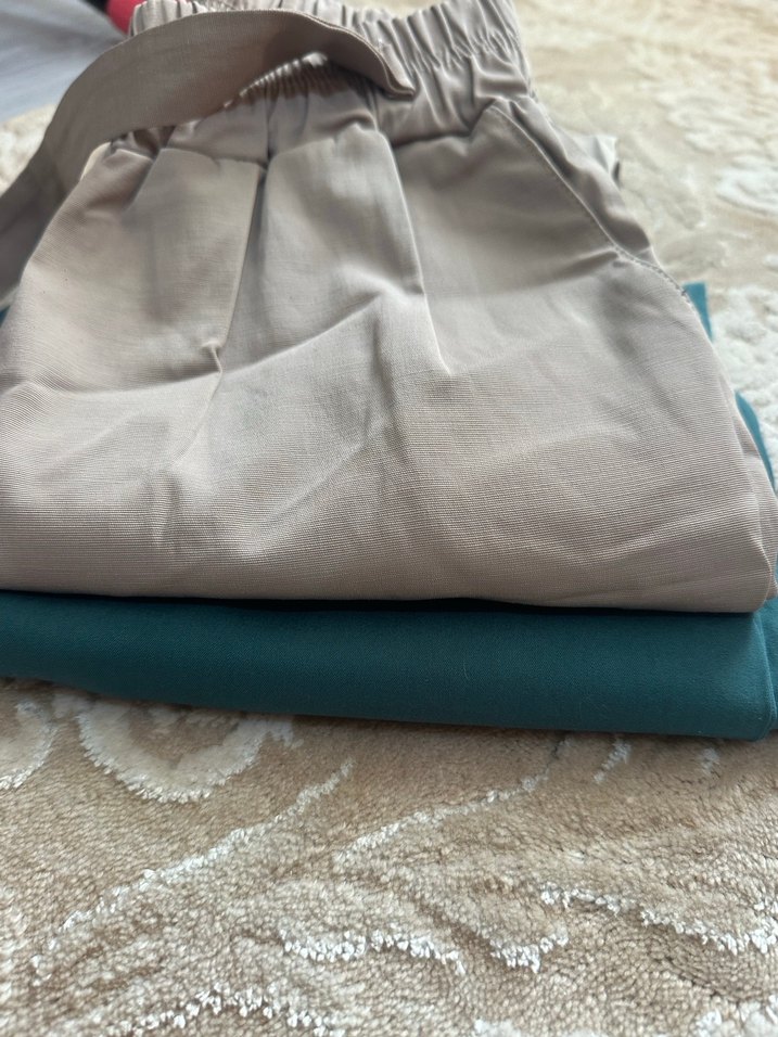 Kadınlar için bej renkli, bol kesim ve normal midi boyda, yumuşak sentetik kumaştan kemerli rahat pantolon. Günlük rahat sokak stili için uygundur.