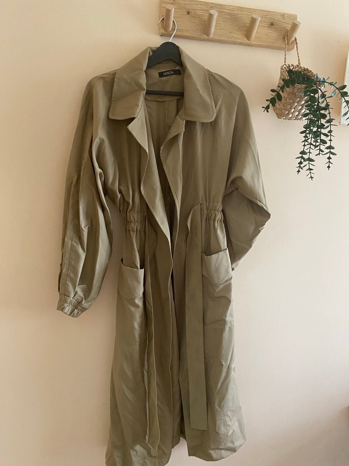 Kadın bej keten trençkot, kemerli ve bol kesimdir. Uzun kollu, minimal ve desensiz tasarıma sahiptir. Günlük sokak stiline uygundur.