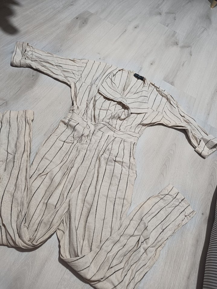 Kadınlar için keten kumaştan, uzun kollu, kemerli ve çentikli yaka detaylı bej renkli tulum. İnce çizgilerle sade ve rahat bir günlük stil sunar. Keten gibi sorunsuz tulum