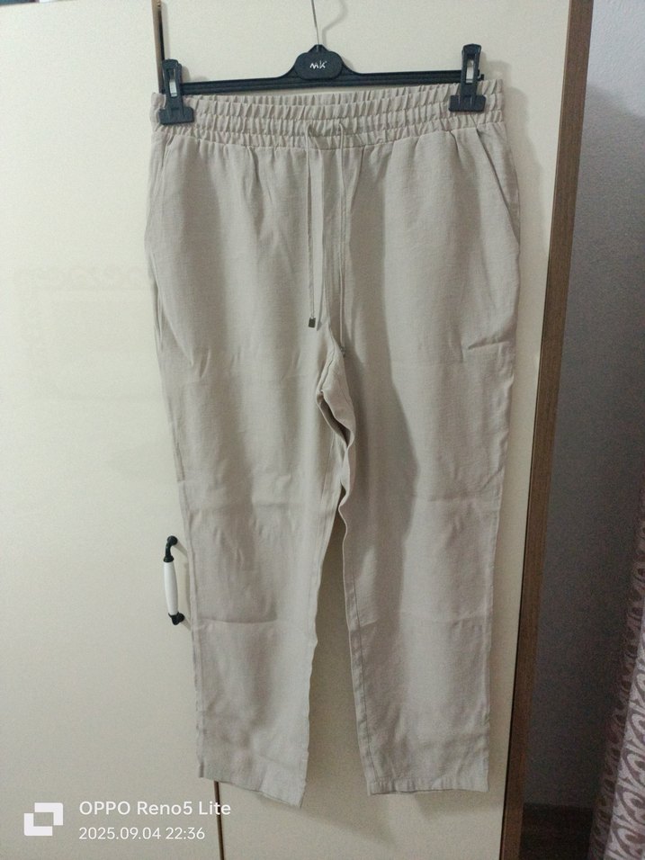 Kadınlar için bej keten pantolon, bol kesim ve normal midi boy. Kemerli, desensiz ve günlük sokak stiline uygun rahat modeldir.