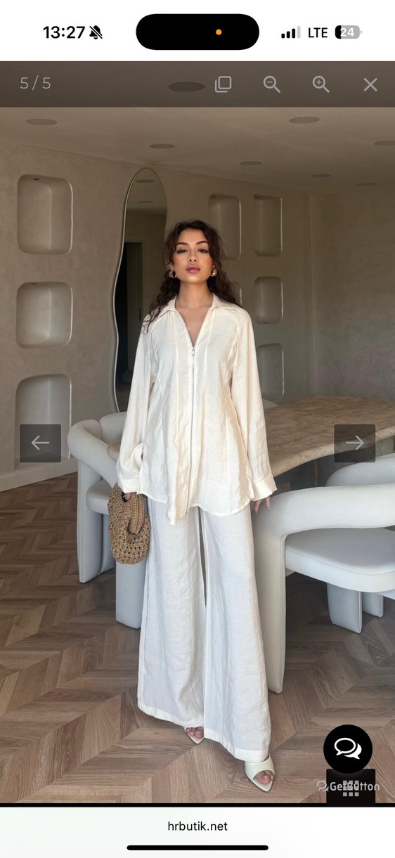 Kadınlar için keten kumaştan yapılmış, bol kesim, uzun kollu ve V yakalı beyaz takım. Minimalist bohem tarzıyla günlük kullanım için rahat ve şık görünüyor.