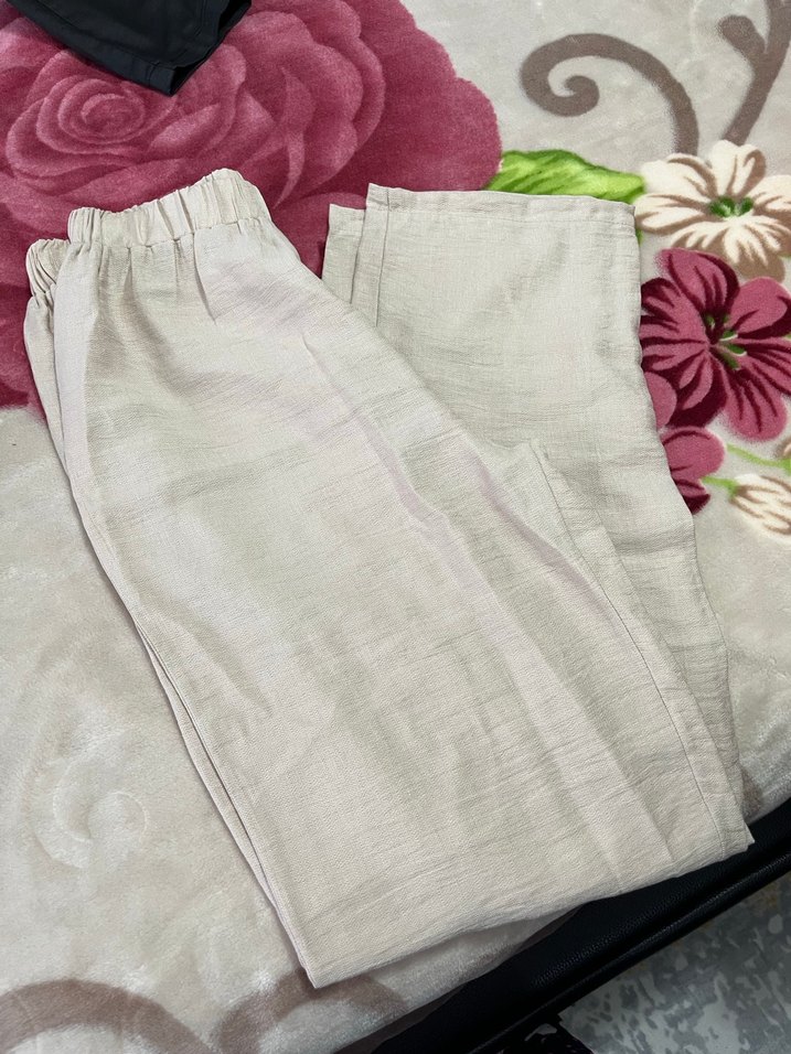 Yumuşak keten kumaştan, bol kesim, bej renkte, kadın pantolonu. Günlük bohem tarz için uygundur. Taş rengi