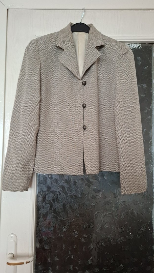 Bej keten kumaştan yapılmış, düğmeli, klasik yakalı kadın ceket. Uzun kollu ve normal boyda, iş ortamına uygun şık bir parça. İki kol arası 54 boy 60 cm.Ölçüleri dikkate alın.