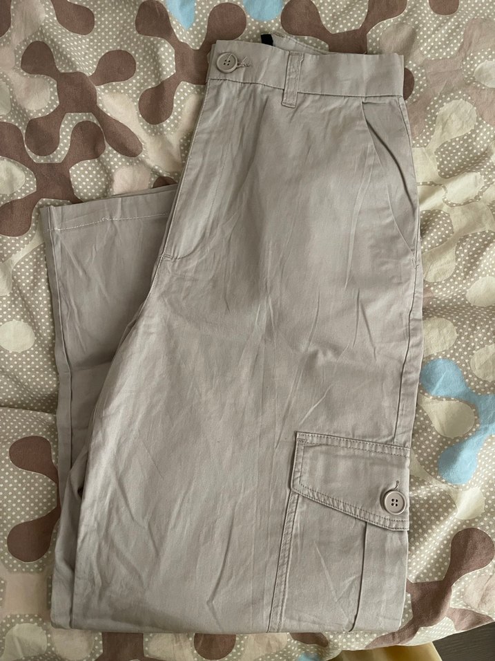 Düğmeli detaylara sahip, keten kumaştan bej renkli, salaş kesim midi boy kadın pantolon, günlük rahat stil için uygun.