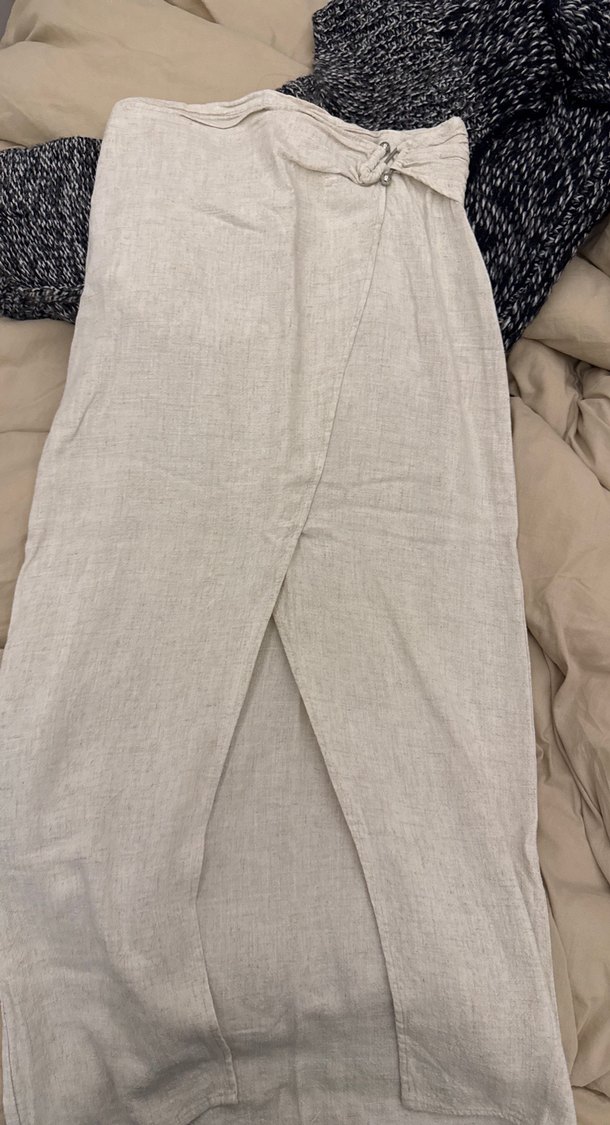 Kadınlar için yumuşak keten kumaştan yapılmış, drapeli ve salaş kesimli bej uzun pantolon. Rahat ve sade tarzıyla günlük kullanıma uygundur.