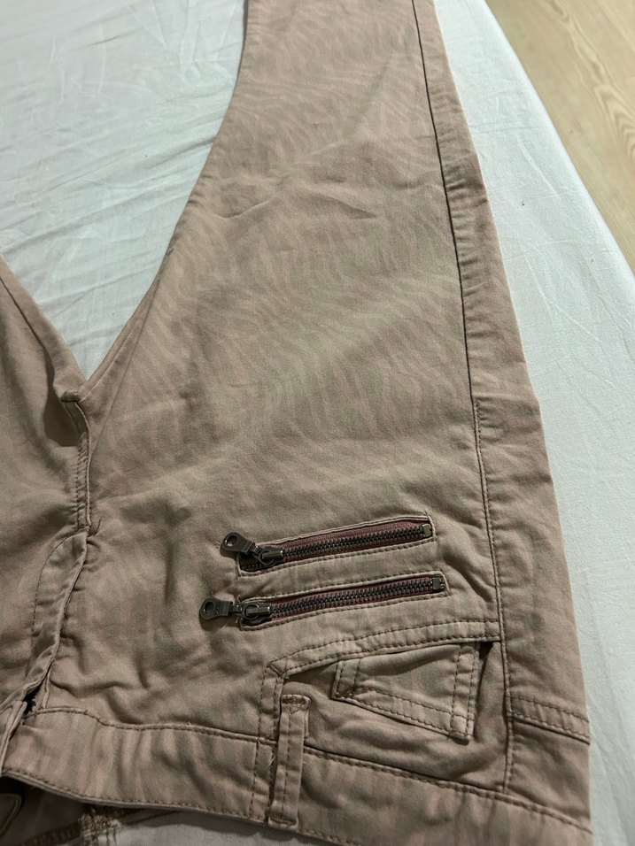 Bej keten kumaştan, fermuarlı detaylara sahip, günlük kullanıma uygun, sokak modası tarzında, vücuda oturan kadın pantolonu.