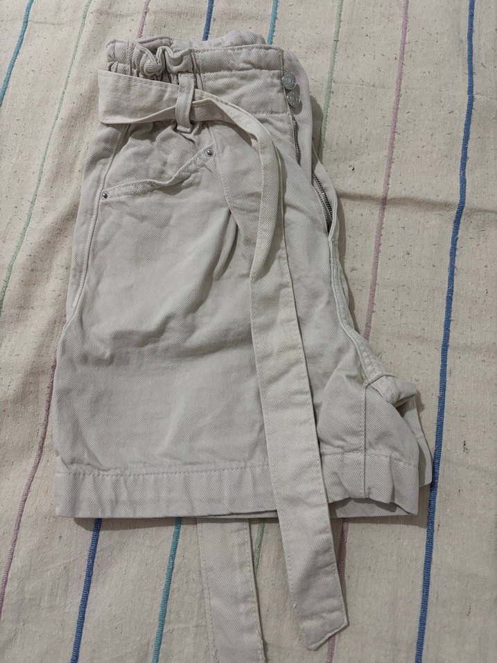 Kadınlar için keten kumaştan yapılmış, bel kemerli, bol kesim ve bej renkli mini şort. Sokak stiline uygun, desen içermeyen rahat bir tasarıma sahiptir.