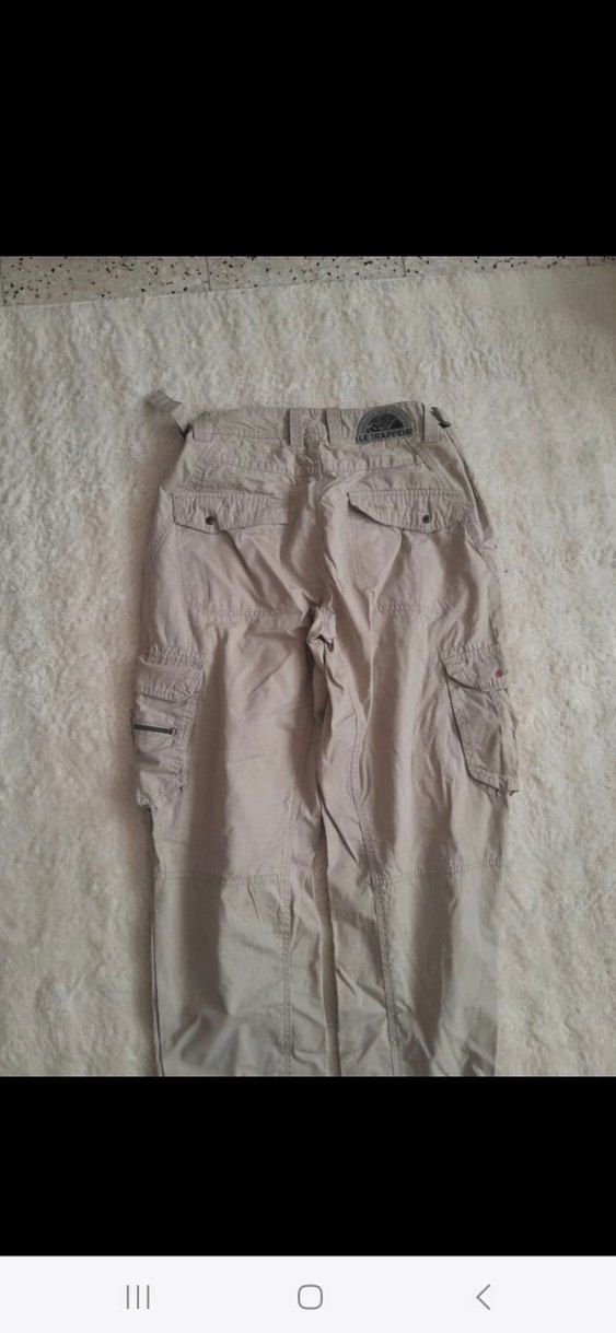 Kemerli, bol kesim, bej keten kumaştan kadın pantolonu. Çoklu cepleriyle rahat ve gündelik dış mekan kullanımı için uygun.