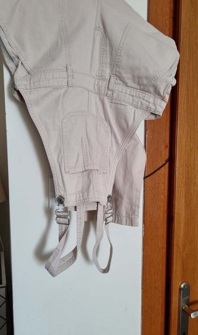 Bej renkli keten kumaştan, askılı ve tokalı kısa tulum. Rahat kesimi ve yakası notched lapel, günlük sokak stiline uygun.