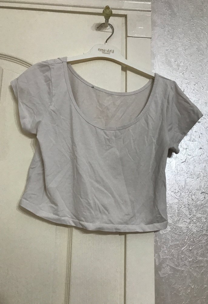 Yumuşak keten kumaştan, kısa kollu ve yuvarlak yakalı, bol kesim bej crop top, günlük kullanım için uygundur.