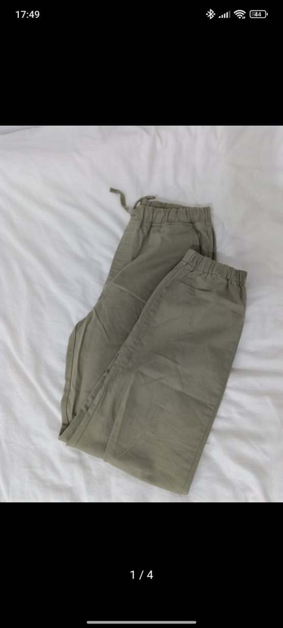 Bol kesim, lastikli bel detaylı bej keten pantolon. Günlük rahat kullanım için midi boy ve desensiz tasarım.