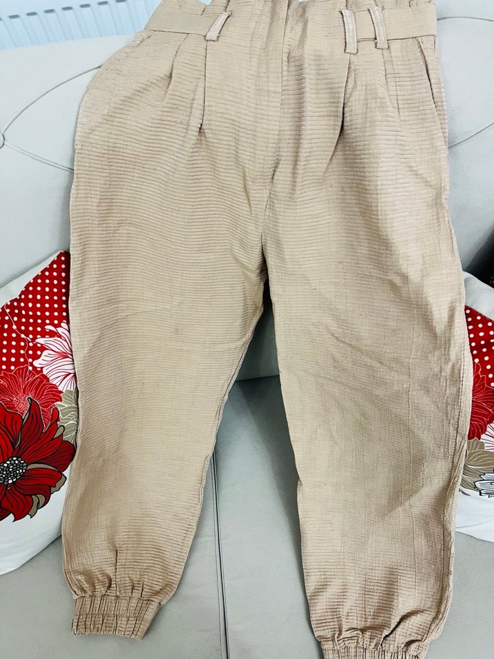 Bej renkli keten kumaştan, pileli ve bol kesime sahip kısa boy pantolon. Paçaları lastikli, rahat ve günlük sokak stili için uygun. Boy ölçtürmeyin rica ediyorum
