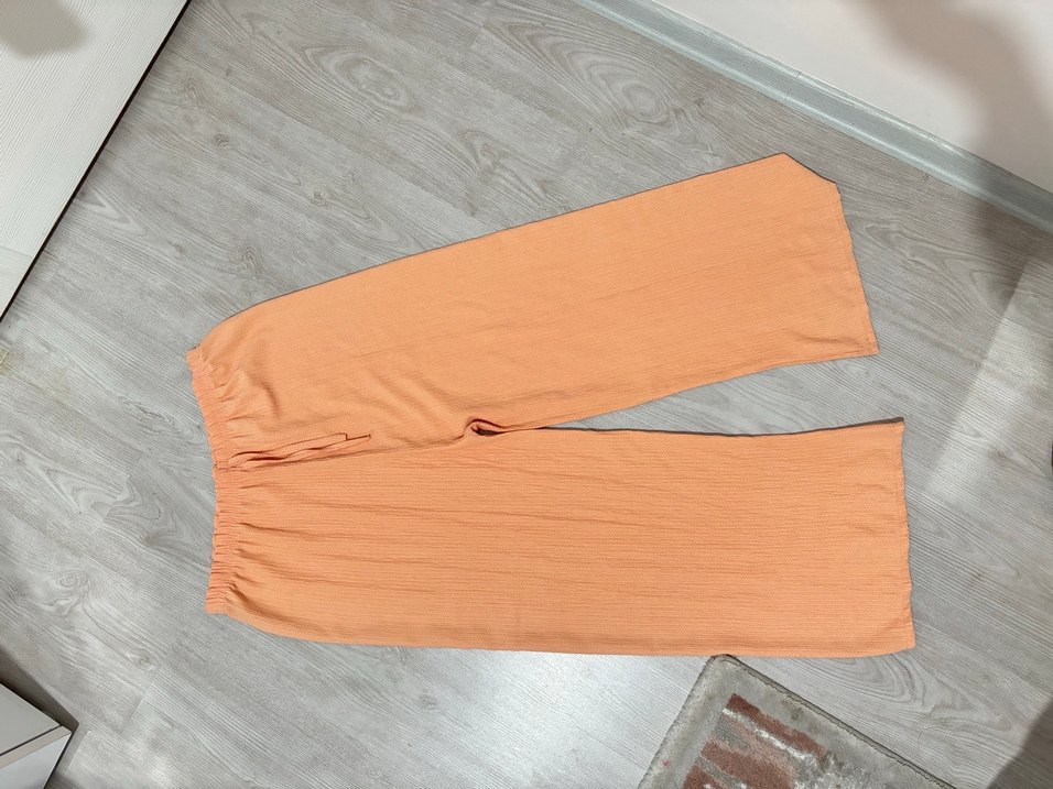 Yumuşak keten kumaştan yapılmış, pilili detaylı, bol kesim ve uzun bej pantolon, rahat ve bohem tarz sunar.